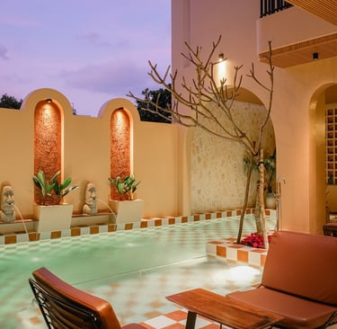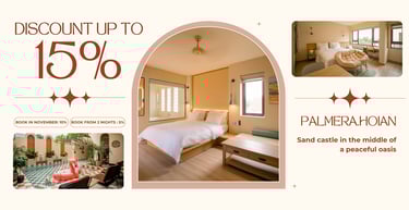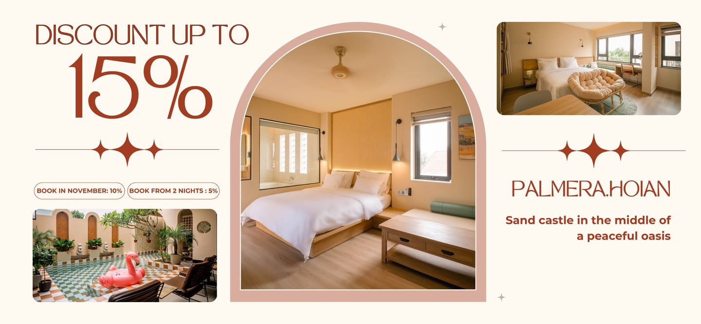 Palmera carries forward the spirit and design palette of @Alsahar.hoian: vivid sand‑color tones and contrasting highlights. Amid the cool, verdant palm garden, Palmera becomes a serene sanctuary in the heart of Hoi An, Red‑star motifs combined with golden–sand hues and lush foliage create a clear boundary between the interior and exterior.