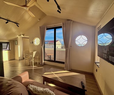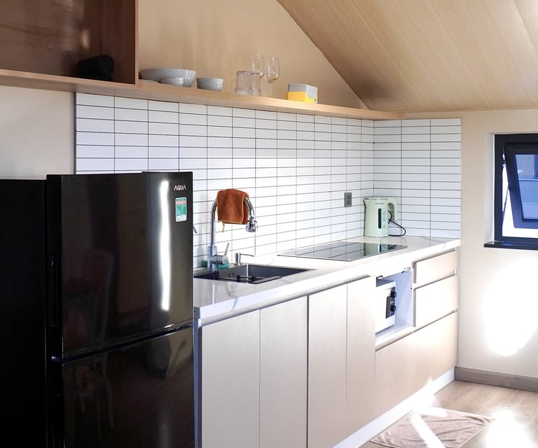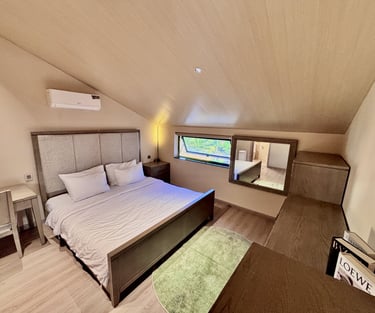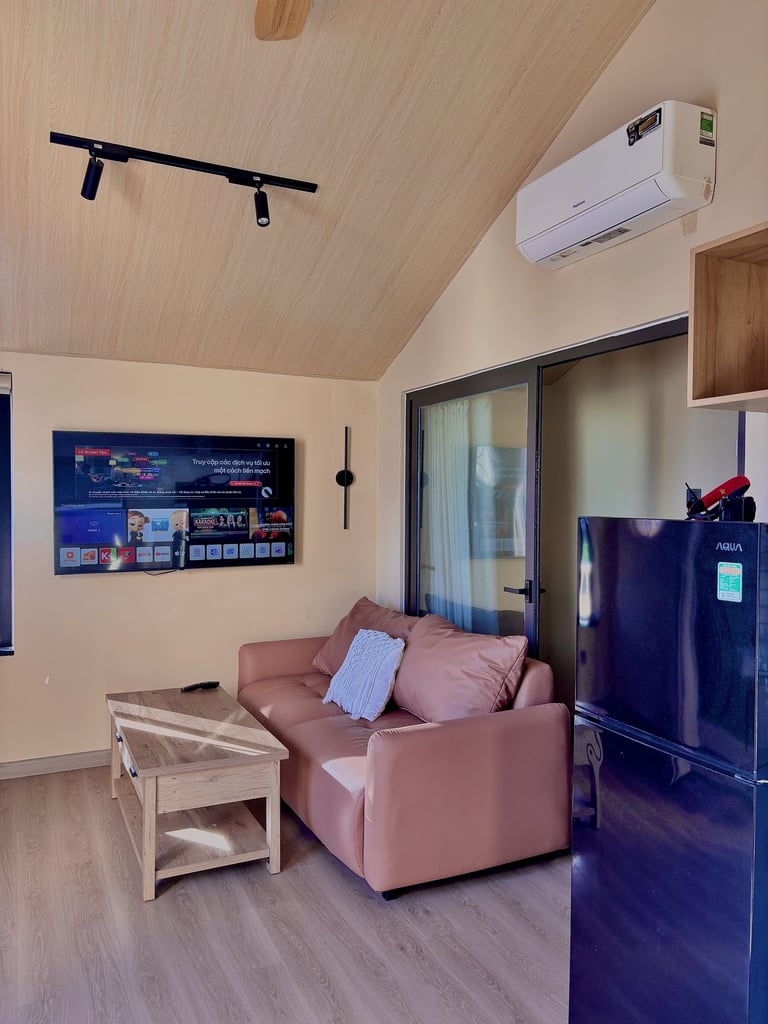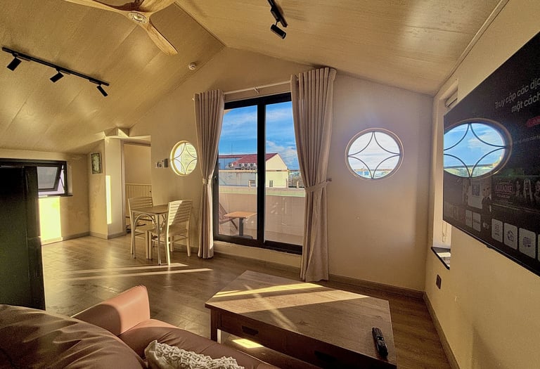 Fully separate bedroom with kitchen area and living room. Highlight with panoramic view overlooking An Lake and Trang Keo lakeshore.