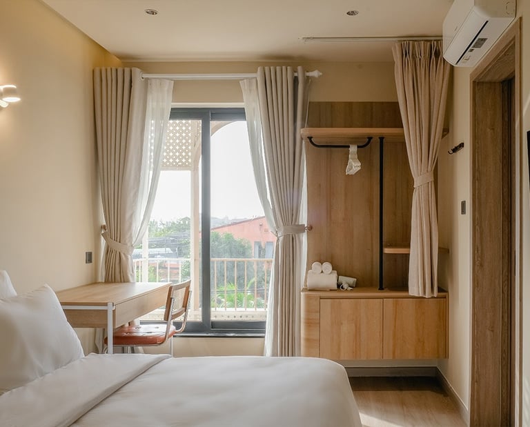 Phòng ngủ tách biệt hoàn toàn với khu vực bếp và phòng khách. Điểm nổi bật với tầm nhìn bao quát Hội An và bờ hồ Trảng Kèo.