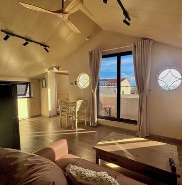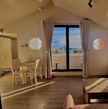 Căn phòng có rất nhiều cửa sổ, đón trọn ánh nắng bình minh và hoàng hôn.